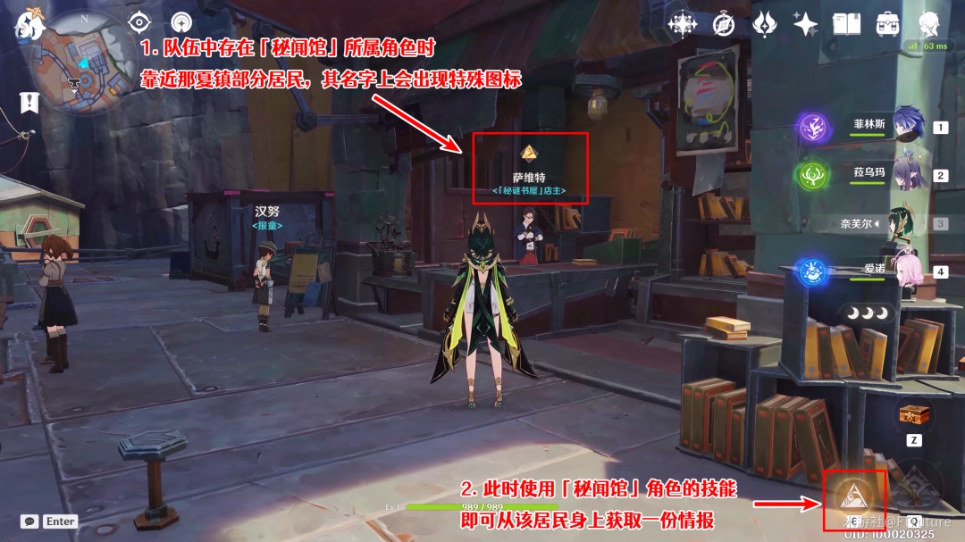 队伍中存在「秘闻馆」所属角色时,靠近挪德卡莱的部分居民,其名字上方会出现特殊图标,表示可以从这个居民身上获取情报。此时使用「秘闻馆」角色的技能,即可获得任务道具「已记载的情报」。
