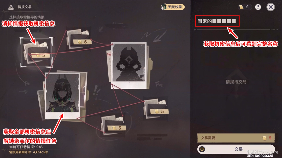以上就是「收集情报」和「情报交易」的具体玩法了,任务本身属于彩蛋性质,没有原石、成就等重要奖励,不打算抽取「秘闻馆」角色的旅行者也无需在意。