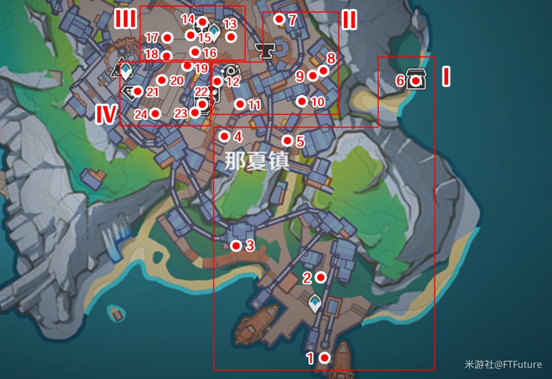 月之二版本中,可收集的情报共24份,均位于挪德卡莱的「那夏镇」。由于数量较多且点位密集,因此这里我将全部点位分成了4个区域,便于查看,后面会按照序号顺序逐个进行介绍。