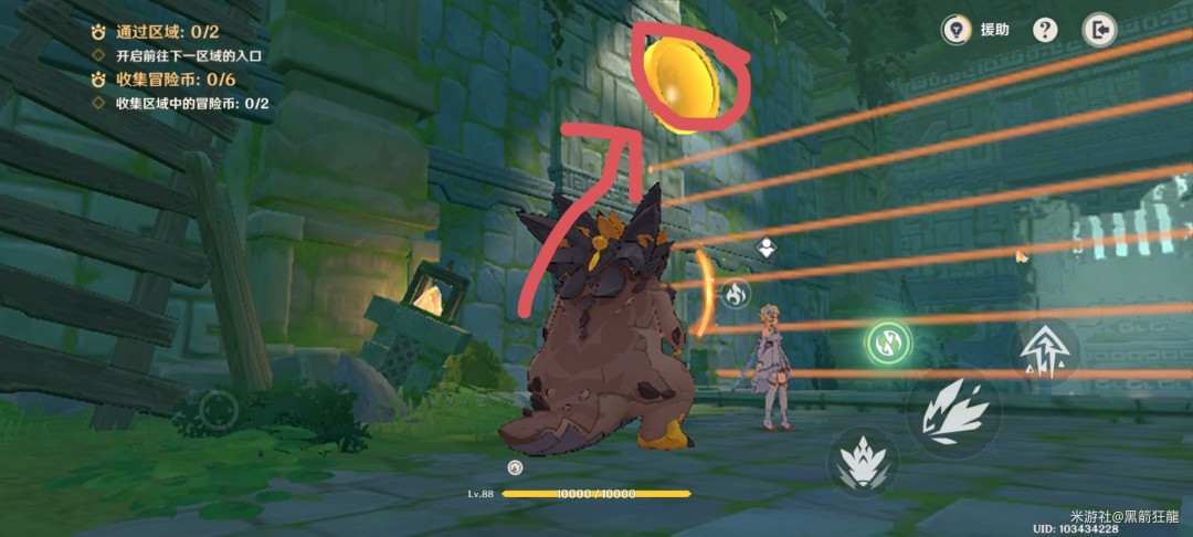 绕过激光后,下来拿第二个金币,攻击橙色按钮。