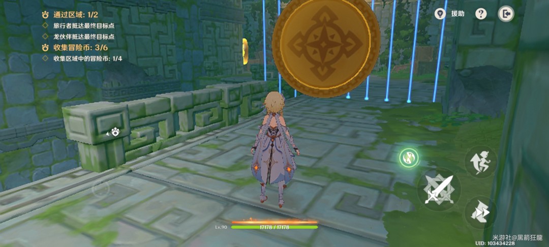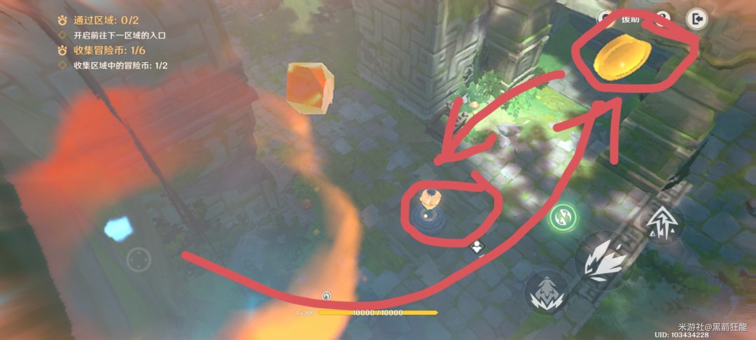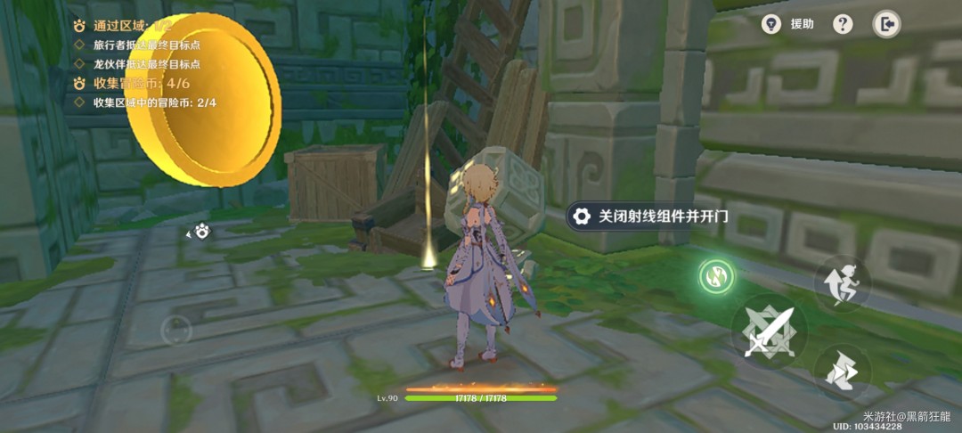 切换旅行者,关闭射线组件并开门,拿旁边的第五个金币。