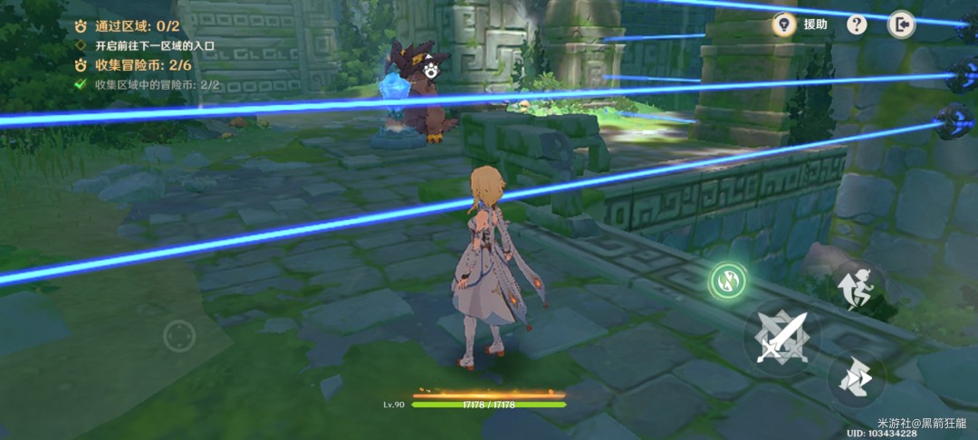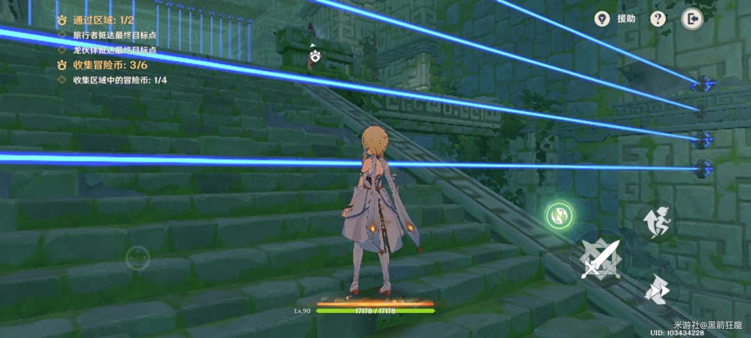 切换旅行者,拿第四个金币,走到蓝色激光前。