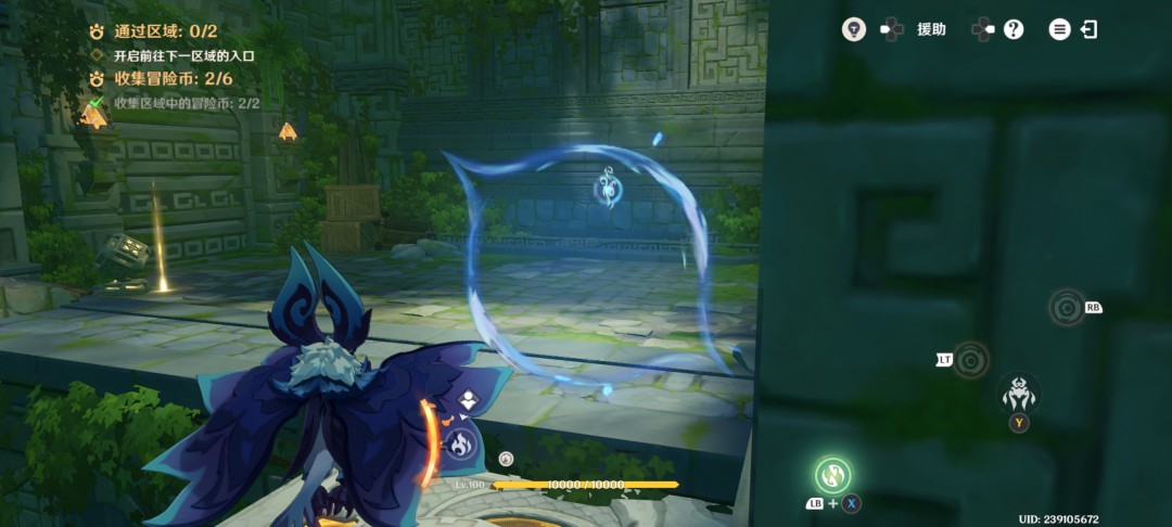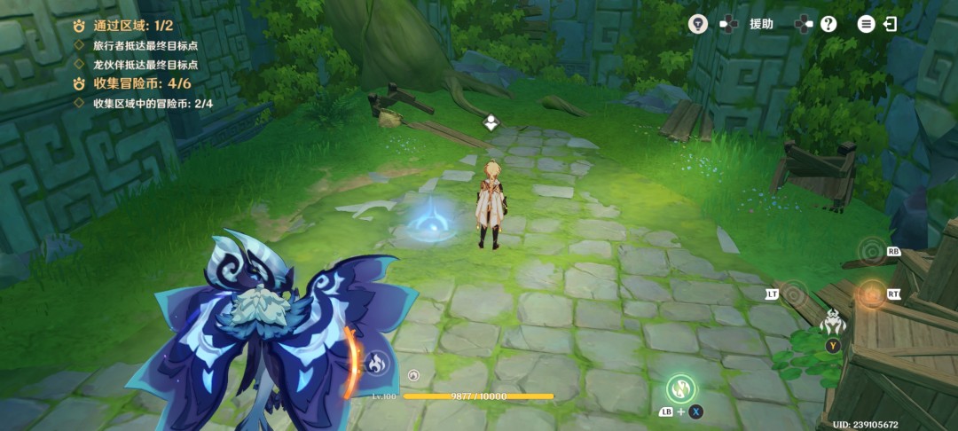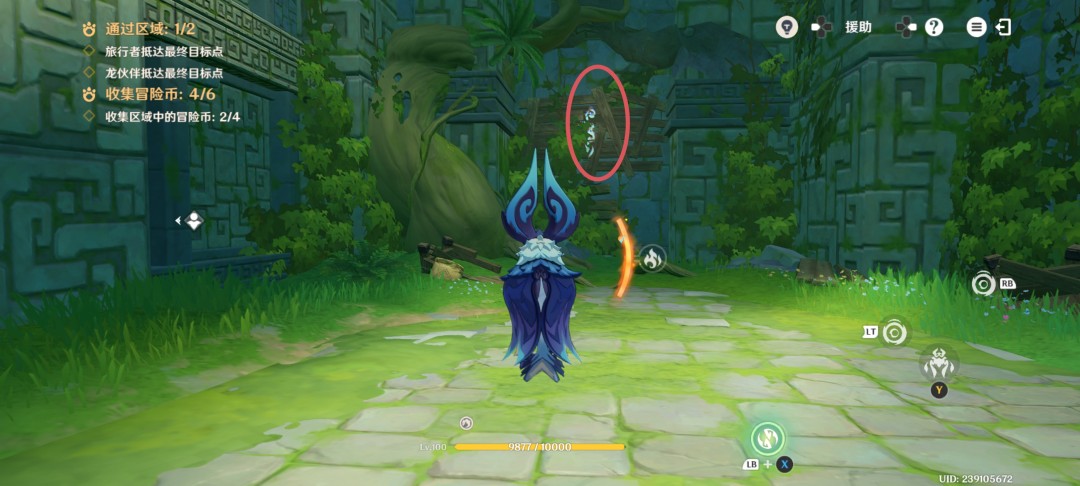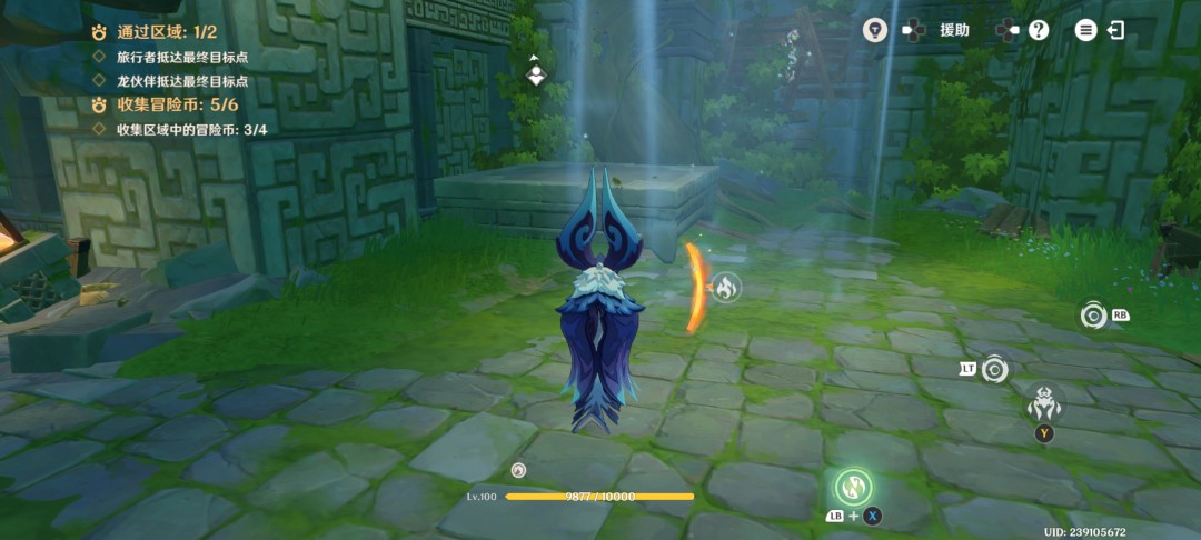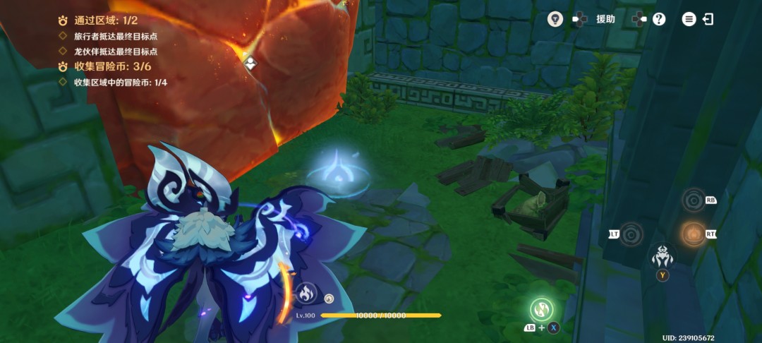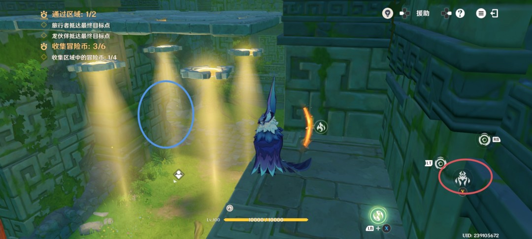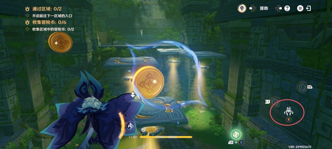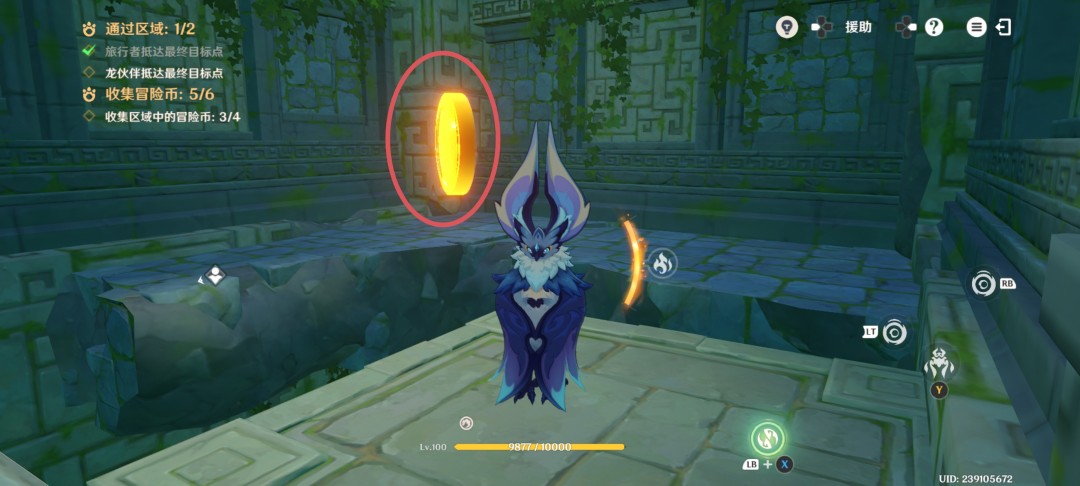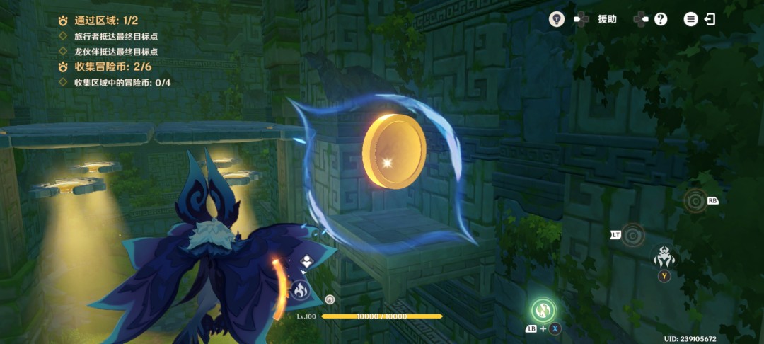 紧接着视角切换瞑视龙;移动到旅行者旁边,此处长按跳跃键即可高高跃起;利用这一能力拾取金币,并在金币的位置转动视角;