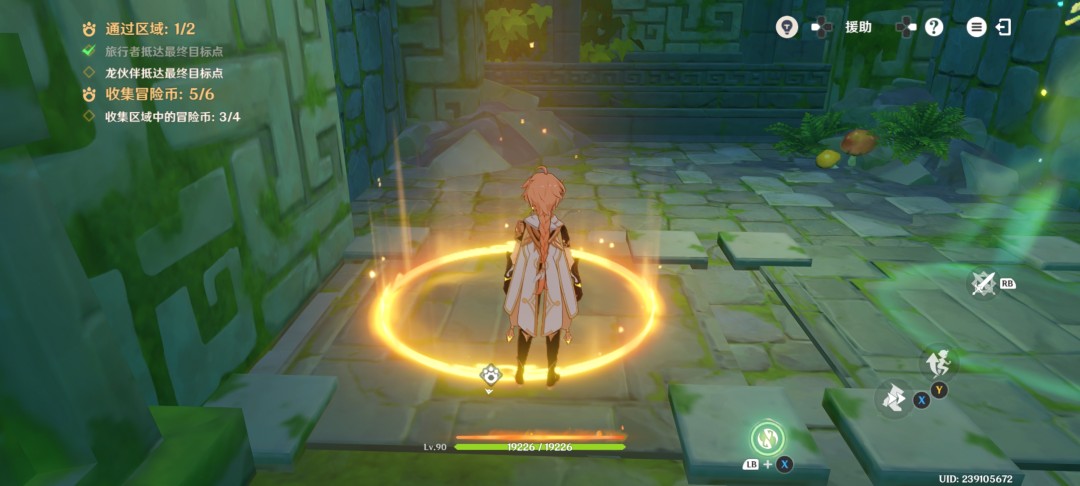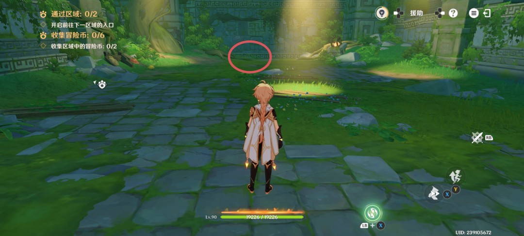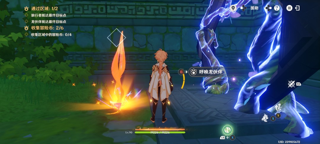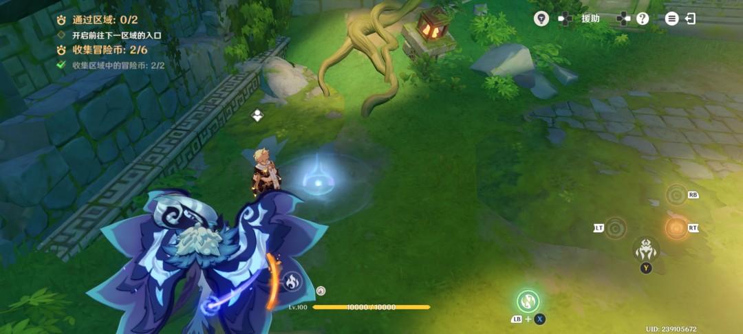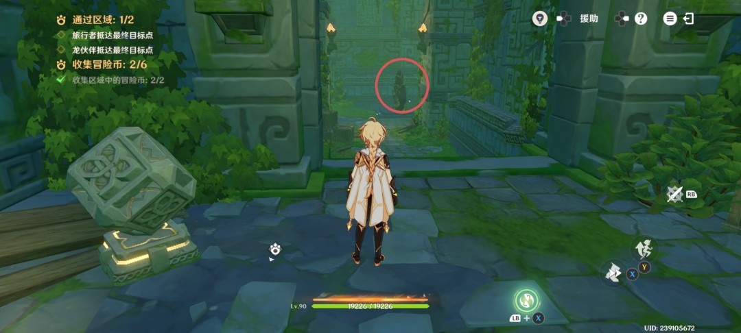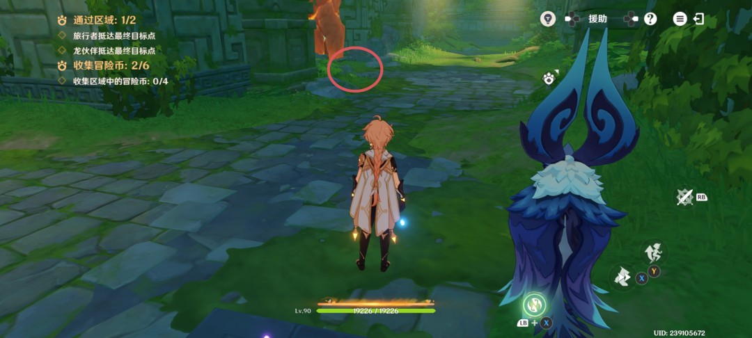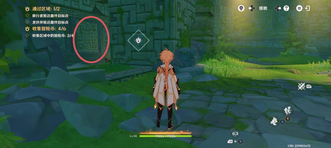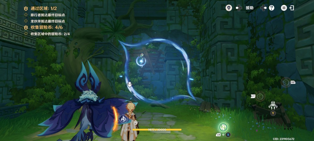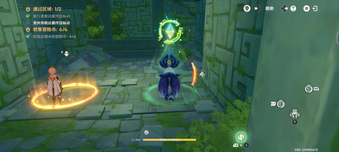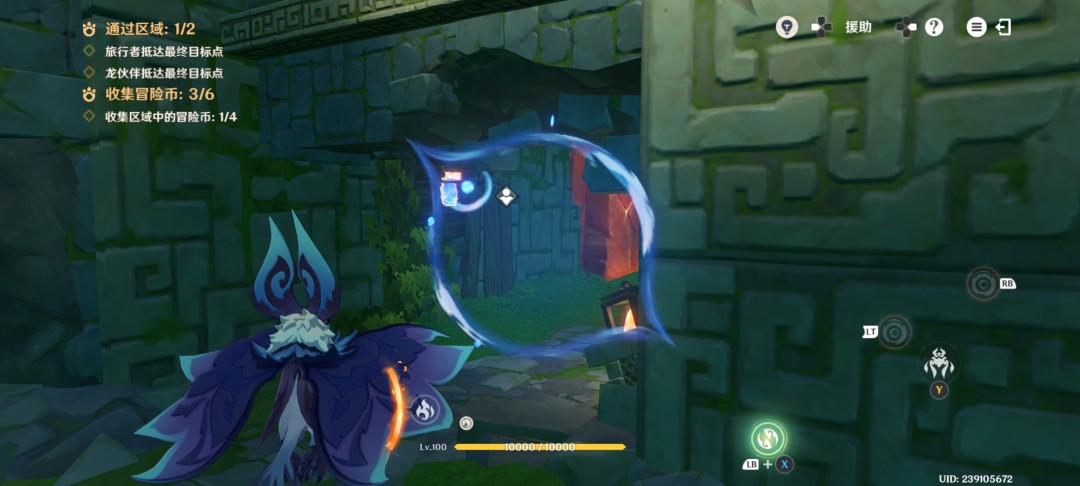 紧接着视角切换瞑视龙;移动到旅行者旁边,此处长按跳跃键即可高高跃起;利用这一能力拾取金币,并在金币的位置转动视角;