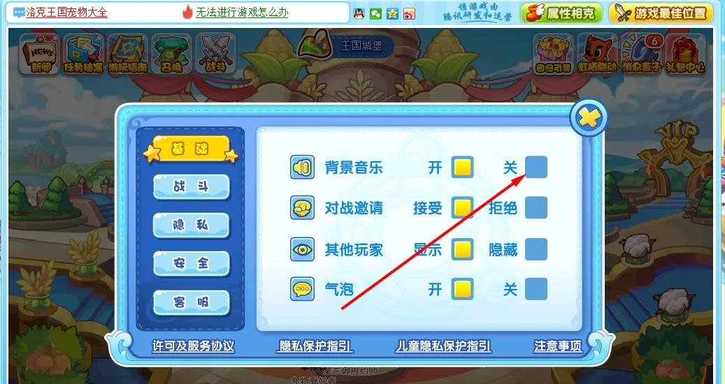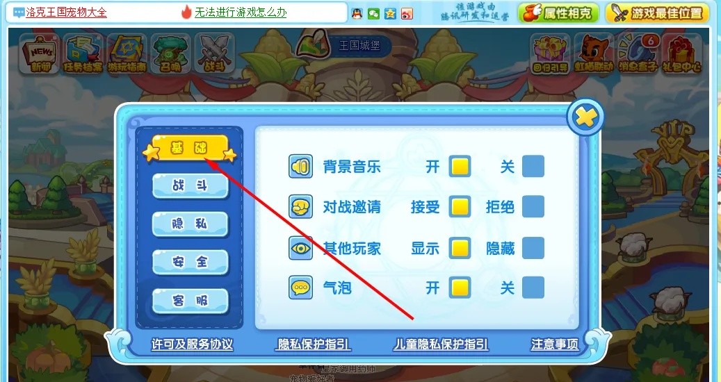 1、首先打开洛克王国游戏,点击【系统】选项;2、进入系统页面后点击左侧的【基础】选项;3、最后在【基础】页面中的【背景音乐】一栏中点击【关】选项。