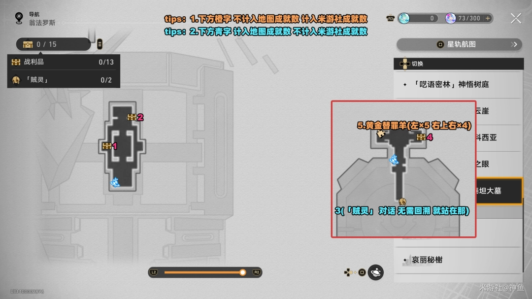 「1个贼灵相关战利品」+「4个黄金替罪羊」+「1个预言算碑」=不计入地图成就数,只计入米游社成就数。
