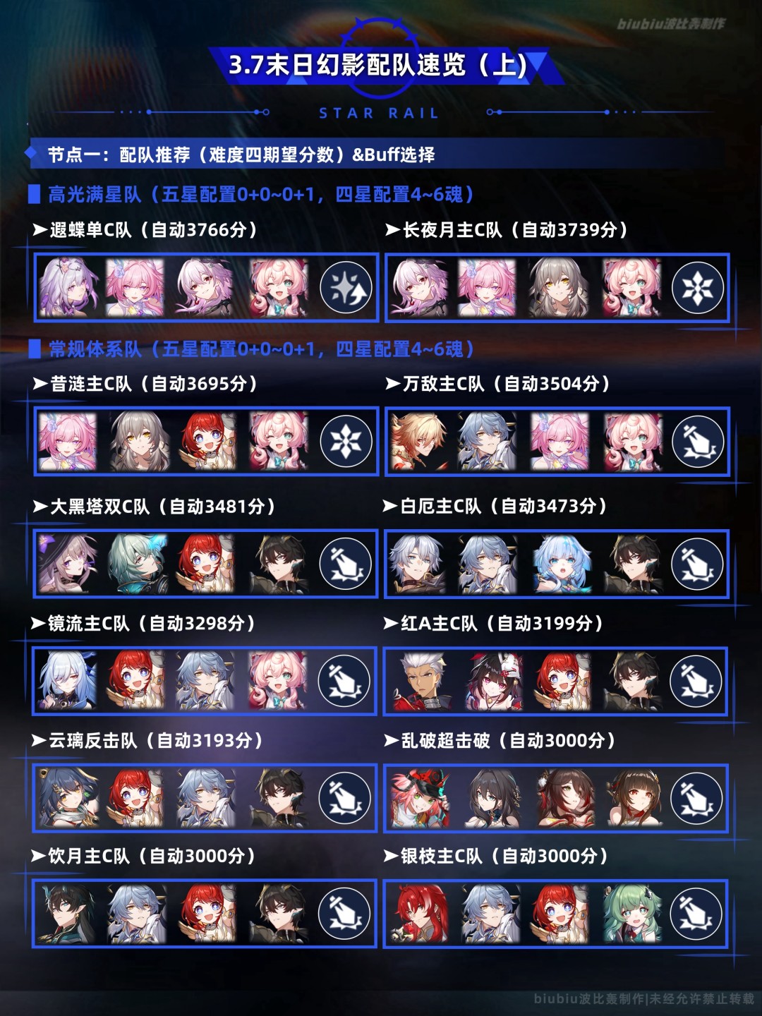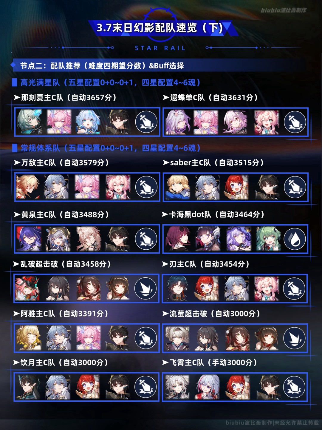 本期有哪些容易拿高分的配队(分为常规配队与低金满星),这些队伍的星魂配置如何,可替换的角色有哪些,分别需要带什么buff(终焉公理)?