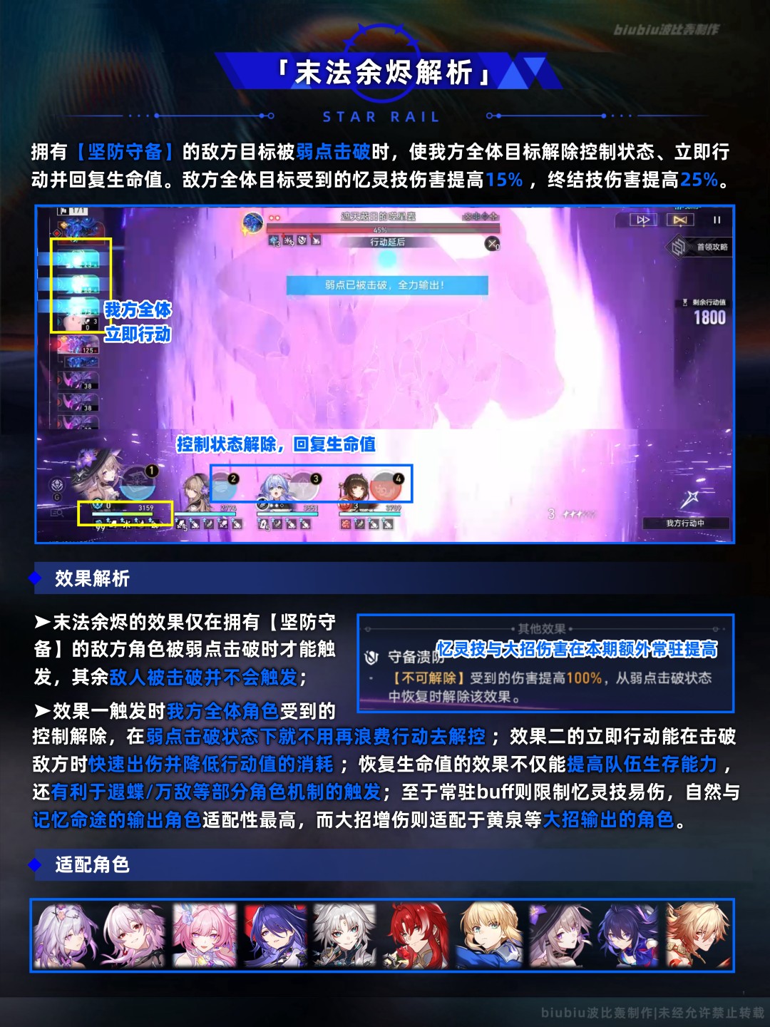 大buff泛用效果依旧不低;忆灵技易伤、恢复生命等效果均对遐蝶队帮助较大,提供的解控则有利于应对上半碎星王虫及其召唤小怪的控制效果,大招增伤则利于以大招为主要输出的角色;至于小buff则需注意上半buff1若主C非记忆命途,只要队友是记忆角色也能吃到最多3层效果;小buff整体需要分析的不多,依据配队选合适的buff即可;