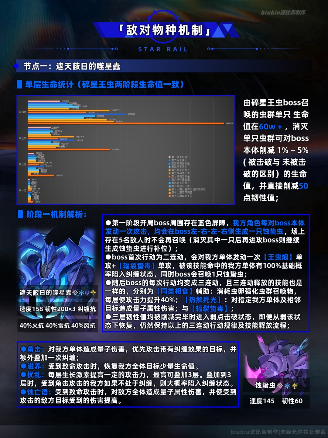 本期上下间的两名敌人我们在往期已经多次遇到过,并且与3.0版本末日幻影的敌人一模一样,只是生命值较那一期翻了两倍之多;因此往期能打满的队伍在本期并不一定会取得高分,只有用近期版本新增的角色入队才能跟上输出;简单来说打上半的碎星王虫注意用群攻输出去消灭小怪来间接扣除boss本体的血量,下半打幻胧需要注意击破流开局要优先消灭破灭玄莲,直伤/DOT流开局则优先去消灭掉丰饶玄莲即可;