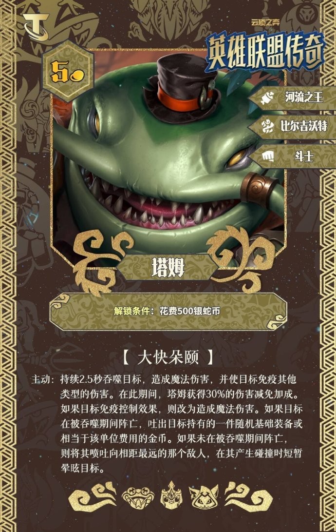 主动:持续2.5秒吞噬目标,造成魔法伤害,并使目标免疫其他类型的伤害。在此期间,塔姆获得30%的伤害减免加成。如果目标免疫控制效果,则改为造成魔法伤害。如果目标在被吞噬期间阵亡,吐出自标持有的一件随机基础装备或相当于该单位费用的金币。如果未在被吞噬期间阵亡,则将其喷吐向相距最远的那个敌人,在其产生碰撞时短暂晕眩目标。