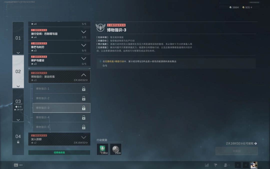 1、任务目标:在任意机密/绝密行动中,累计成功带出5件品质≥紫色的能源燃料类收集品