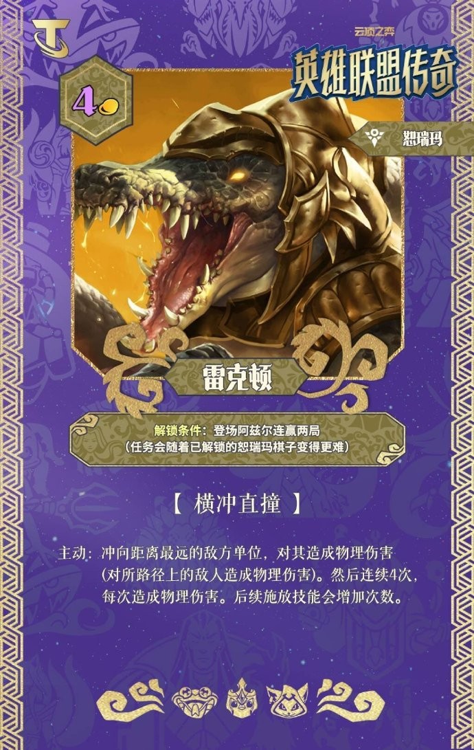 云顶之弈S16版本英雄联盟传奇主题PBE美测服更新了,在新赛季会增加很多新的羁绊和棋子,还有不少老羁绊,老英雄的回归,那么有不少小伙伴好奇各个英雄的技能是什么,下面就给大家带来s16雷克顿羁绊效果一览。