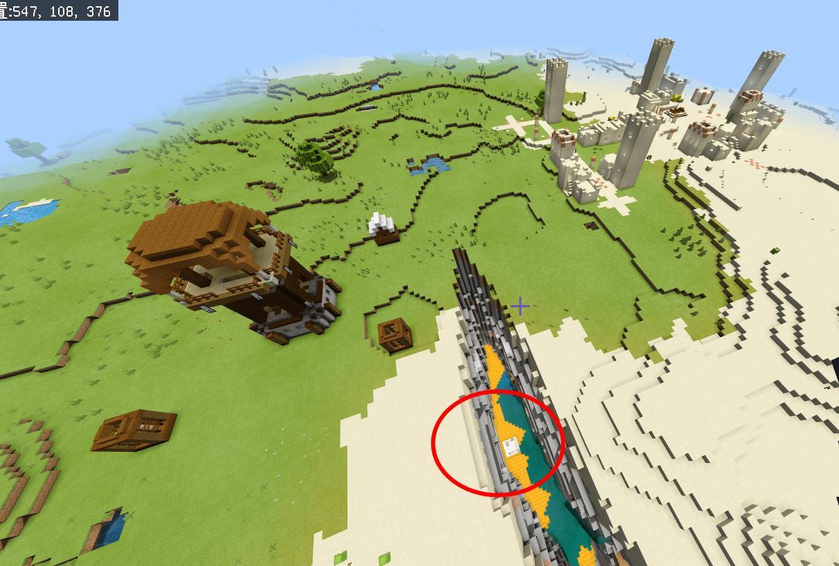 进入地图后我们就可以发现就在我们出生点就有一个村庄,我们升空看一下原来这个村庄在目前版本算是非常大的村庄了,大家都知道在以前版本中,大村庄是能够出现的,但是自从村庄更新以后,以前的大型村庄不复存在,而以前对于村庄最喜欢的莫过于在村庄遇到铁匠铺。所以这个种子对于我们玩家来说,简直是福音,4个村庄意味着我们前期生存根本就不用费吹灰之力。