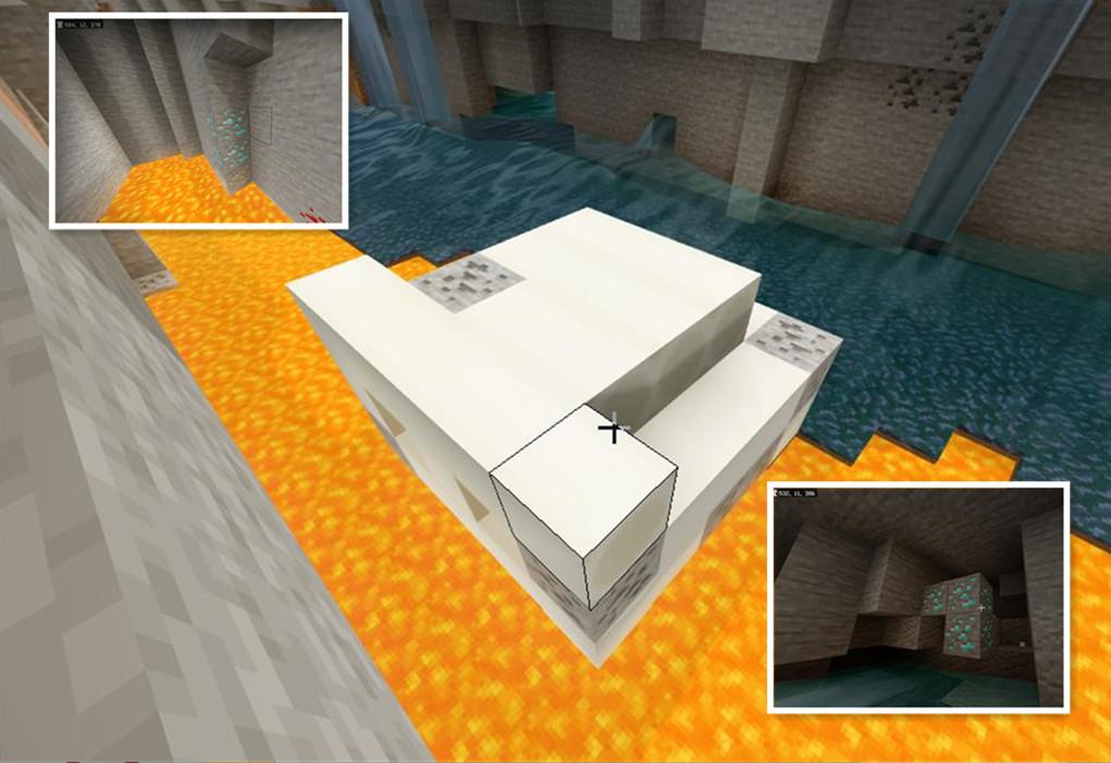 这个骨架看起来是头部的骨架,因为长久的石化,骨头有一部分已经变成了煤块,所以经常在寻找到骨架的时候能够见到煤块就是因为这个原因。就在这个峡谷里面,其实还有两处亮点,一个坐标是:584.12.378的位置,这里能够发现2个钻石方块,在峡谷的另一边我们能够发现另外的三块钻石,坐标是:532.11.386,这样一共就是5块钻石。