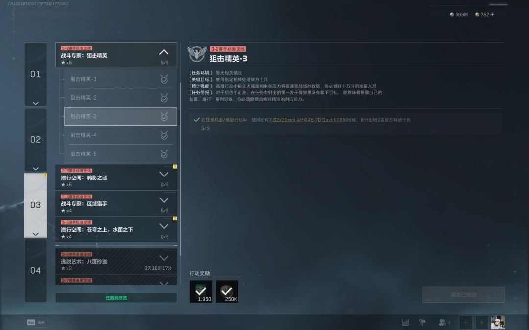 1、任务目标:在任意机密/绝密行动中,使用配有【7.62x39mm AP】或【45-70 Govt FTX】的枪械,累计击败3名敌方特战干员