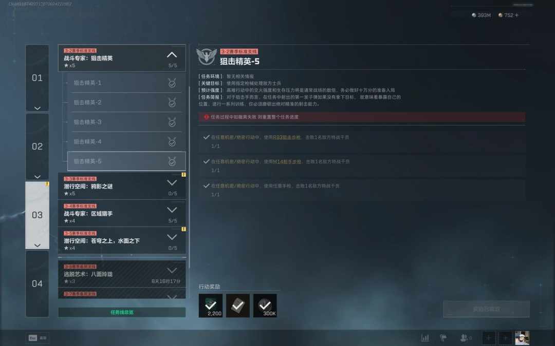 在任意机密/绝密行动中,使用【M14射手步枪】,击败1名敌方特战干员