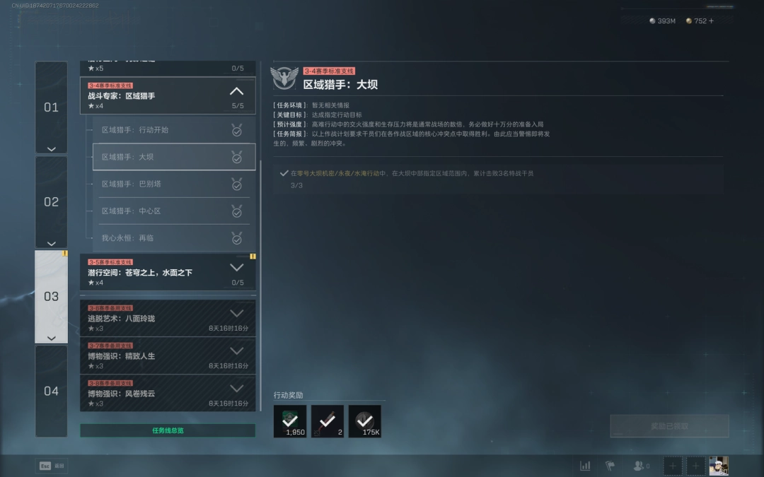 1、任务目标:在零号大坝机密/永夜/水淹行动中,在大坝中部指定区域范围内,累计击败3名特战干员