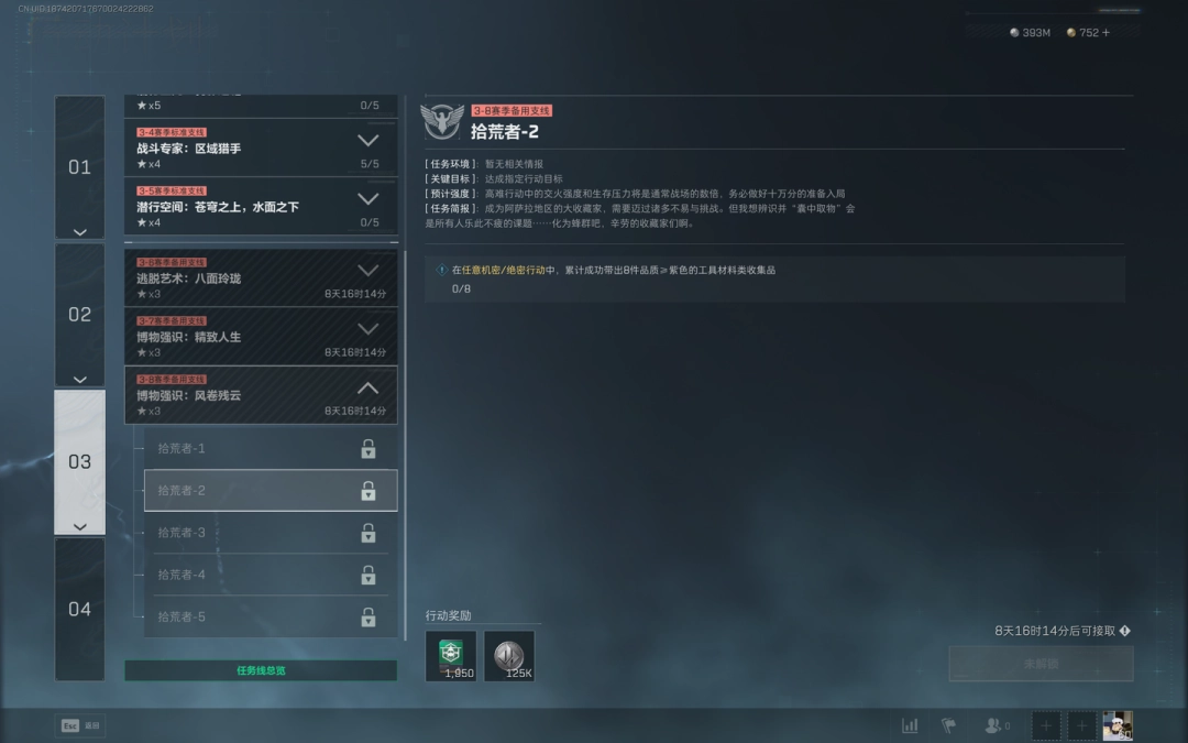 1、任务目标:在任意机密/绝密行动中,累计成功带出8件品质≥紫色的工具材料类收集品