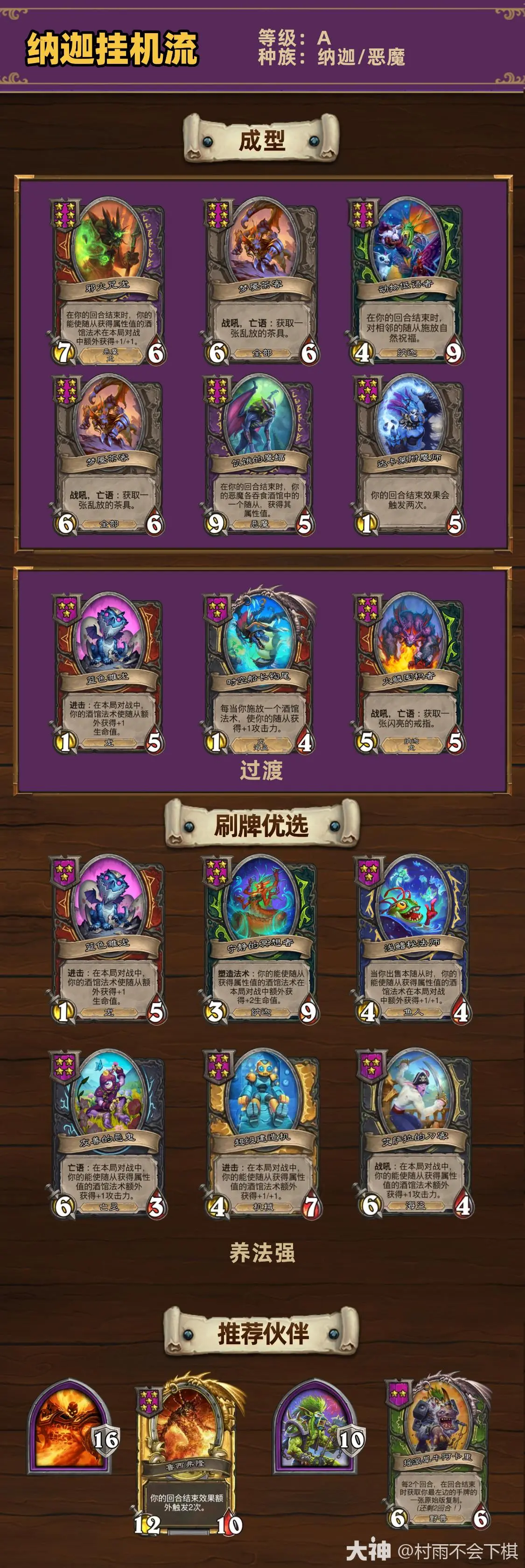 邪火咒龙养法强,动物低语者每回合对融合怪施放自然祝福,给全体随从加身材(包括酒馆随从),随后魔蝠以及阵容中的恶魔随从吃酒馆。附魔师增加回合结束触发次数。