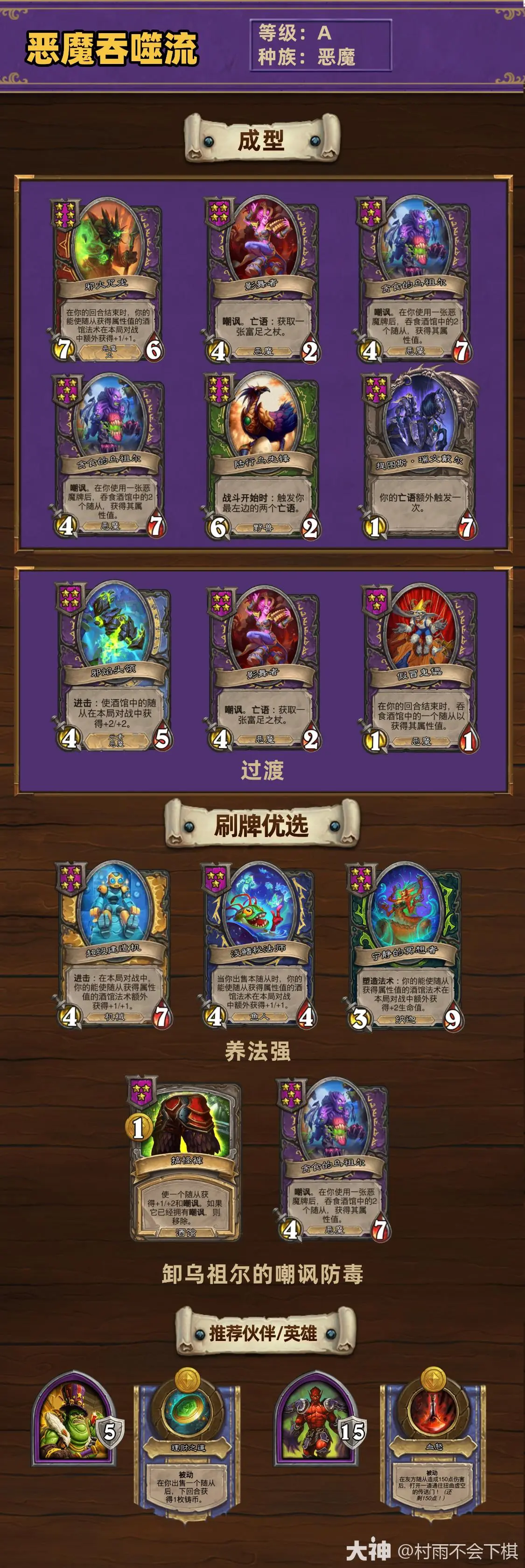 不断养法强,依靠影舞者亡语效果获取富足之杖来养大酒馆。不断打出恶魔来让乌祖尔吃酒馆的随从。