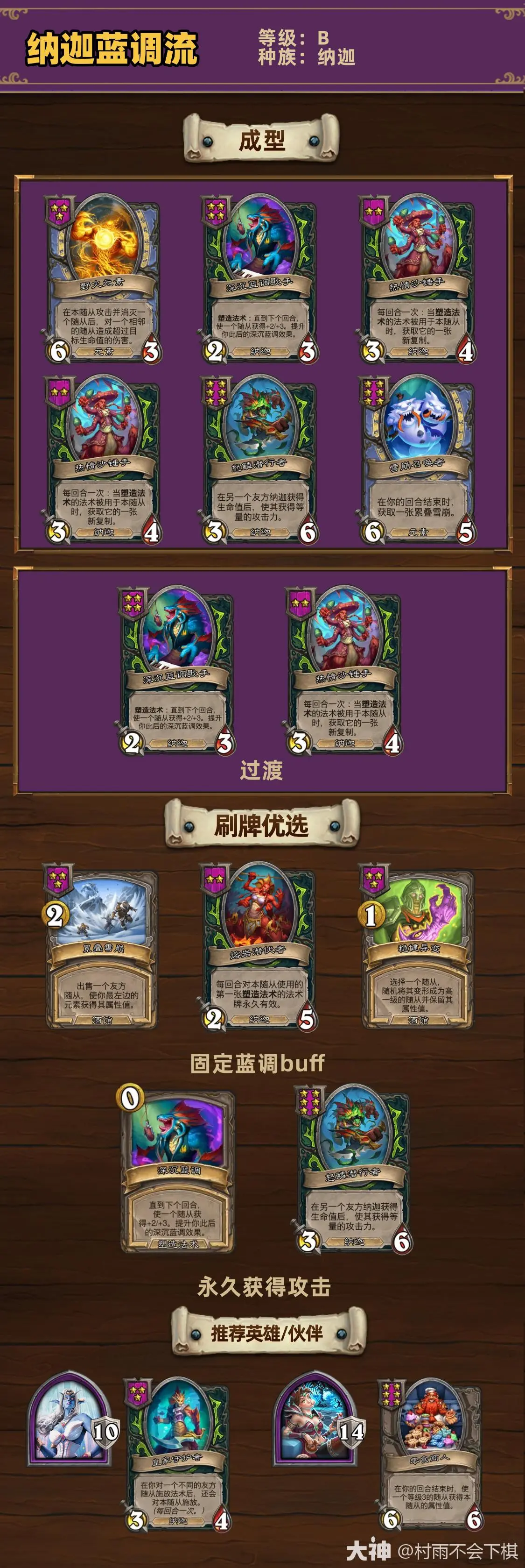 深沉蓝调歌手+热情沙锤手可以不断打出蓝调法术来成长。怒鳞潜行者可以让纳迦获得永久攻击力。元素局可以用雪崩法术将蓝调法术的身材固定到元素上。
