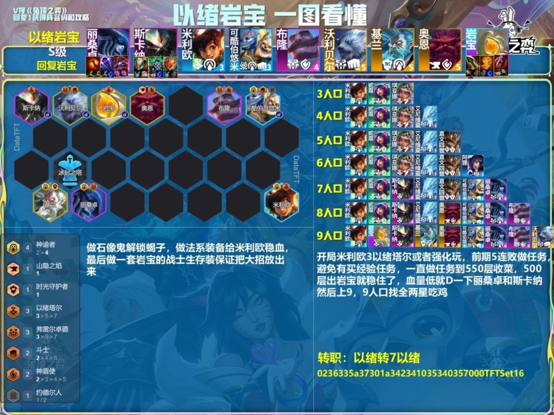 开局米利欧3以绪塔尔或者强化玩,前期5连败做任务避免有买经验任务,一直做任务到550层收菜,500层出岩宝就稳住了,血量低就D一下丽桑卓和斯卡纳然后上9,9人口找全两星吃鸡