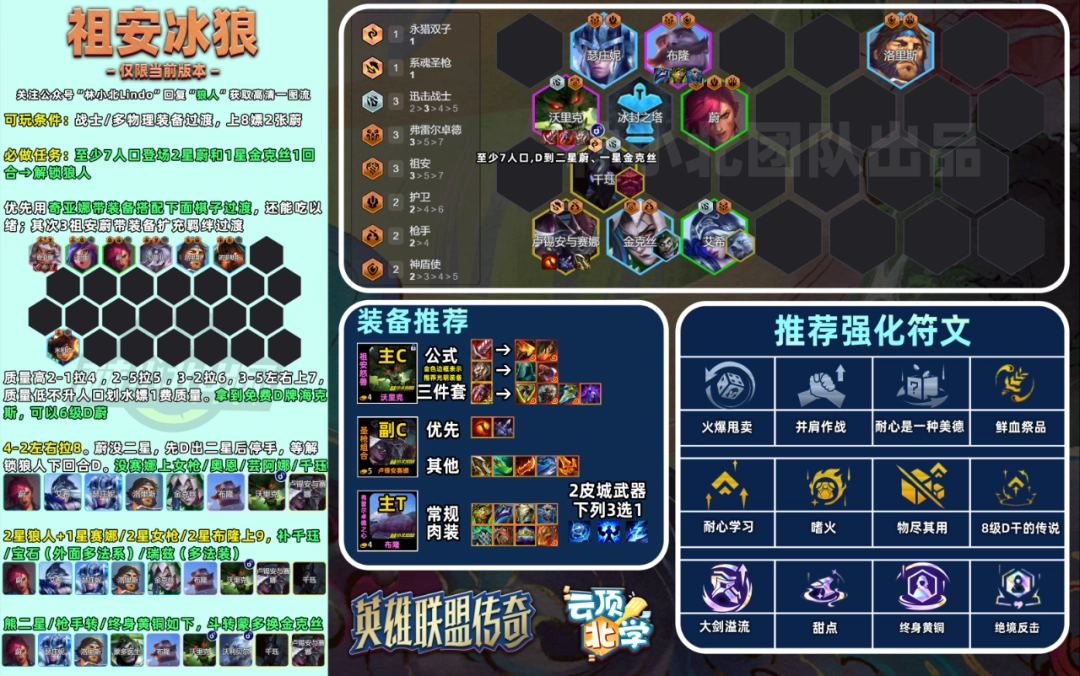 为什么强:最适合新手的运营阵容,整局只用解锁一张棋子,同时1星狼就能锁血,后期还能搭进赛娜和千珏,这两张物理阵容的天花板棋子