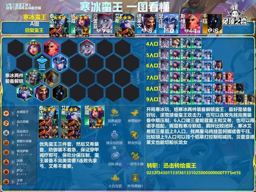 开局寒冰玩,给寒冰两件装备解锁蛮王,最好是装备好玩,滚雪球叠蛮王攻击力,也可以连败先找完美装备中期压制,6人口赌三星妮蔻蛮王和艾希,也可以用诺手搭配,妮蔻有寒冷联动,羁绊比较闭环,寒冰艾希双三星后上8人口,找两星乌鸦挂芸阿娜或者干珏比较胡上9人口可以挂个稻草打控制和减抗,贝蕾亚德莱文也能切船长龙女