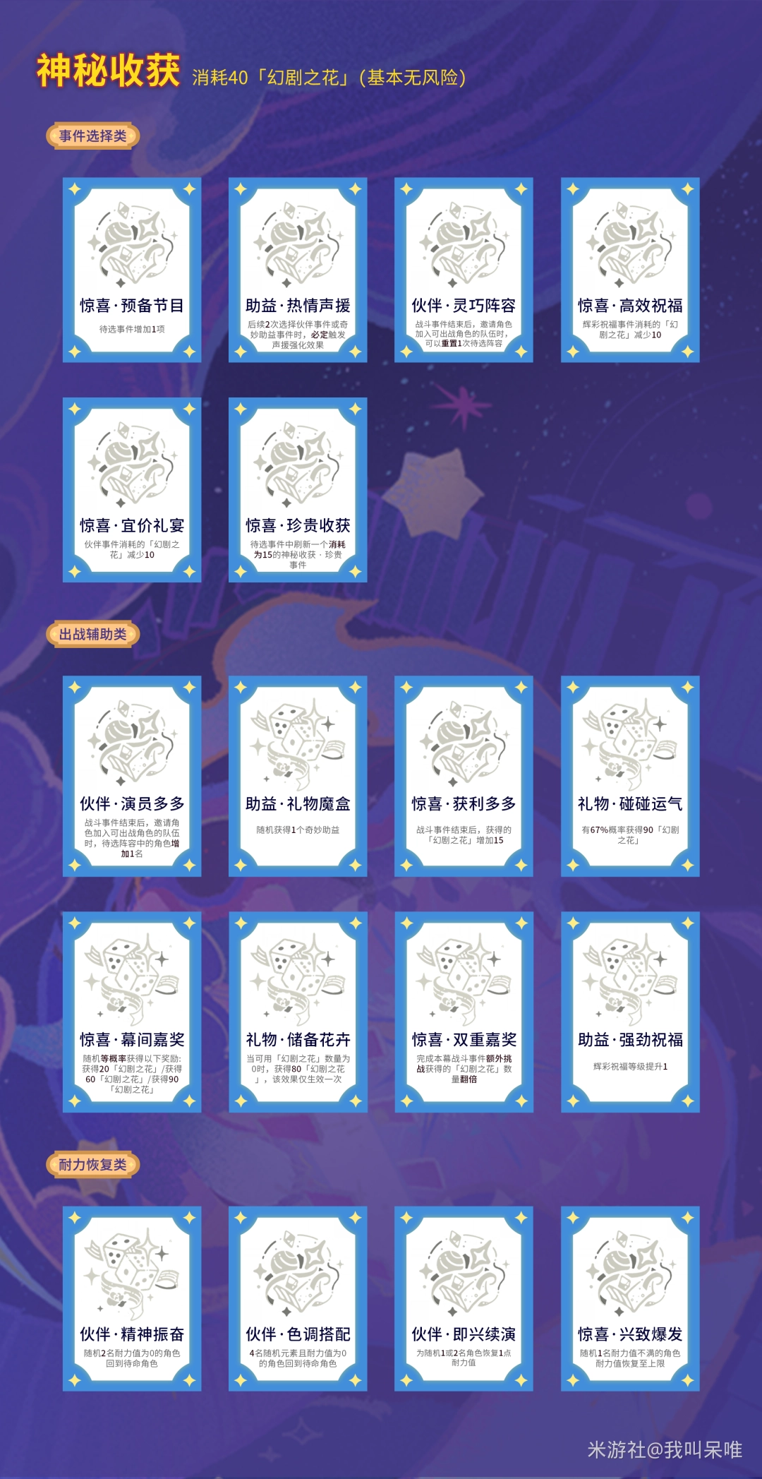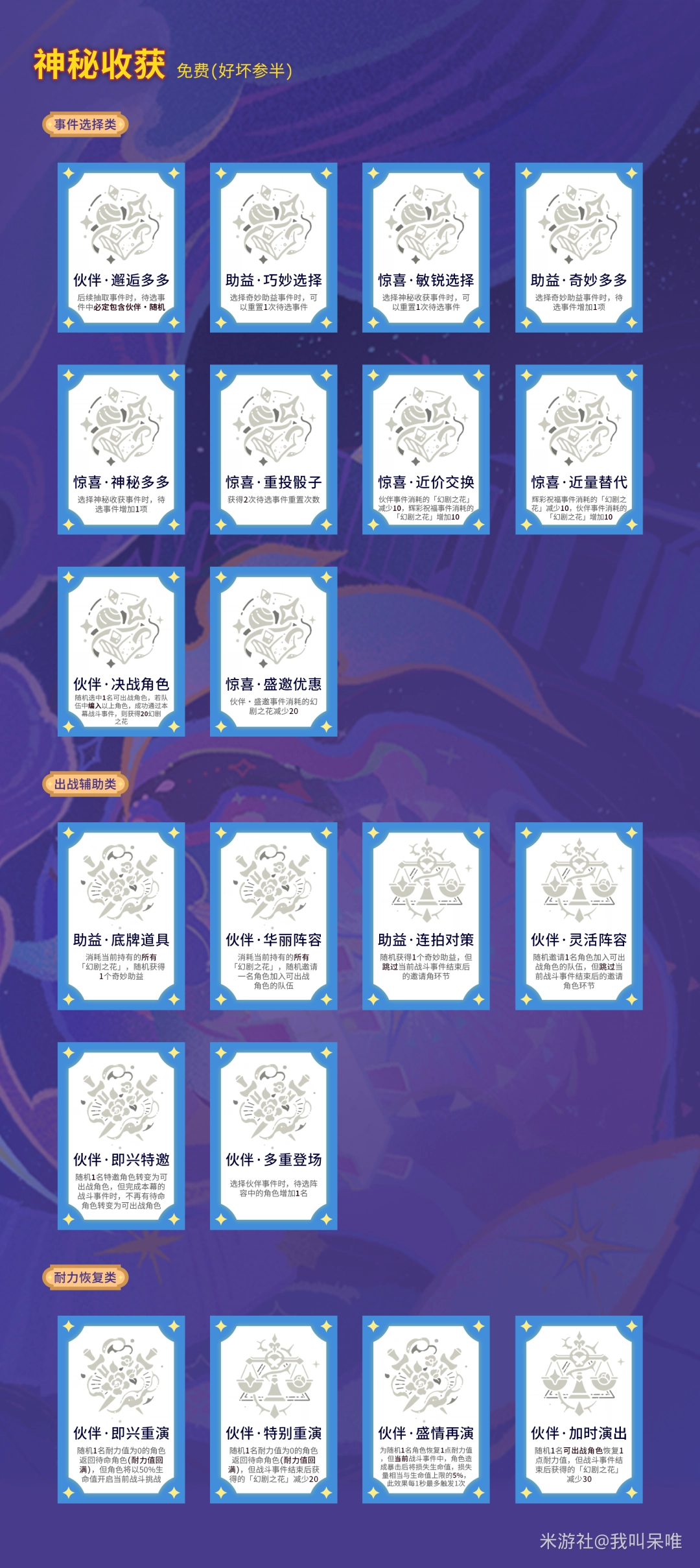 本期祝福提供的加成相对来说较一般,上限高,下限有点微妙,不同队伍都有不同的适配buff,根据自己的角色、作战的队伍元素组合选择即可,非常简单。