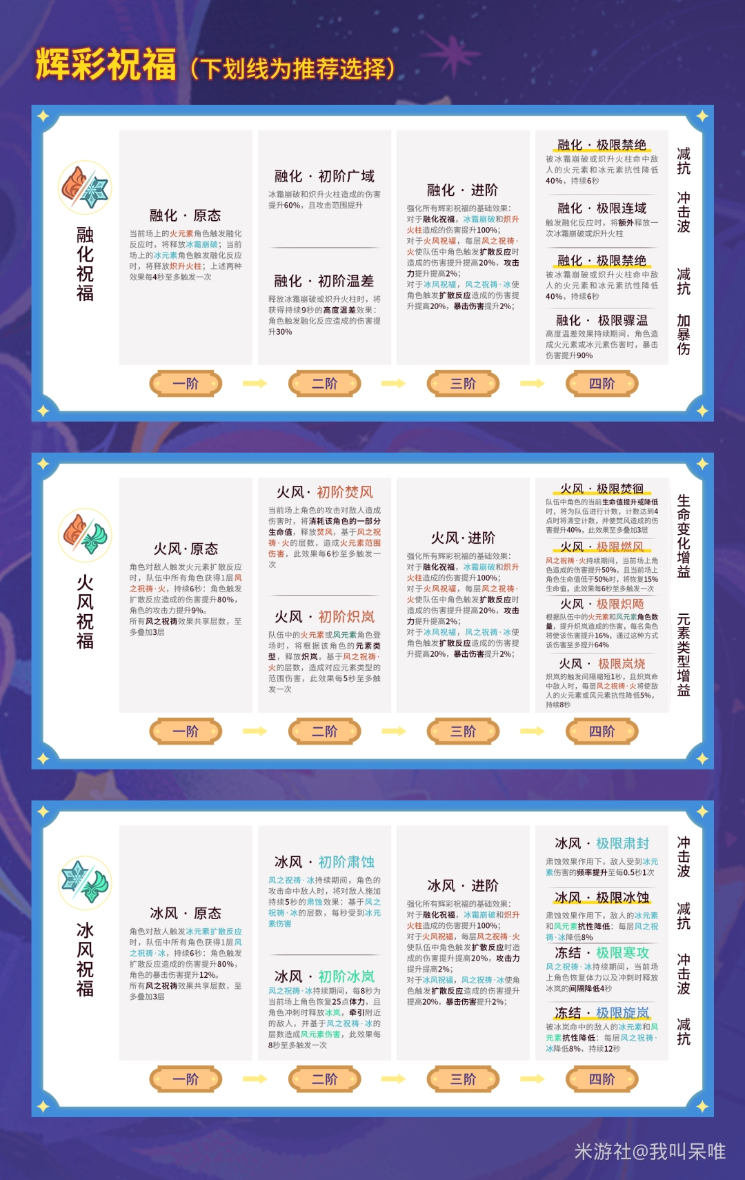 推荐本期以融化祝福和火风祝福为主,冰元素被火元素克制,所以火风比冰风稳定,而且冰风祝福buff给得有点少,建议中后期补强度再选。