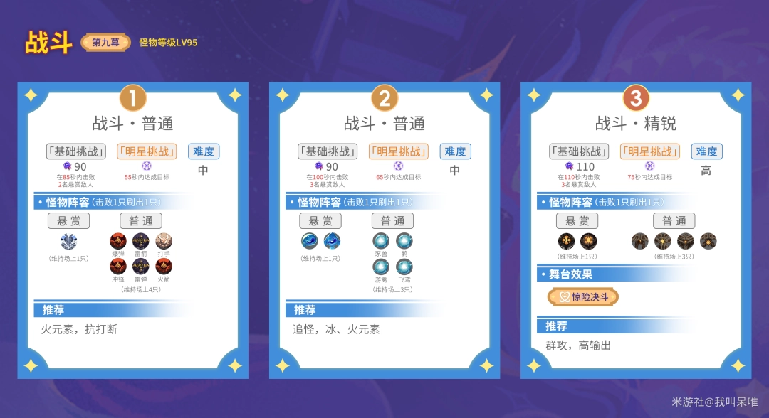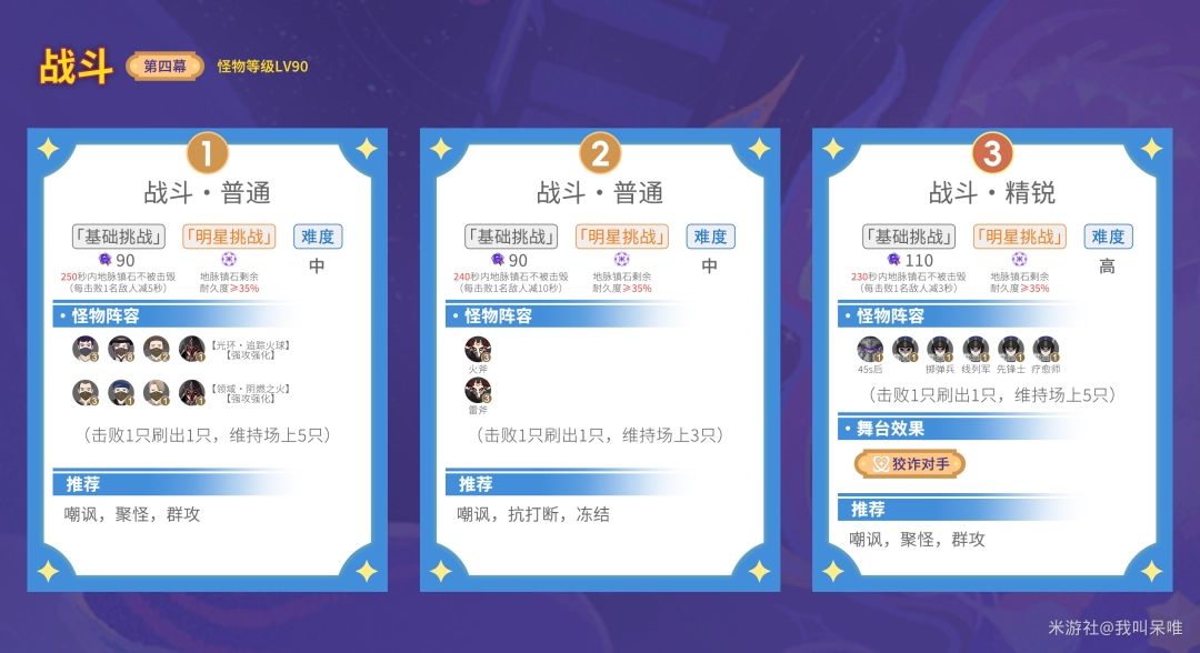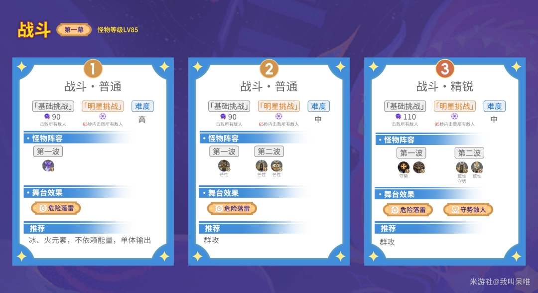 此精锐关卡十分考验队伍对群输出能力,有AOE、追怪会轻松一点,最好有玛薇卡、温迪、万叶等对群强力的角色,其他对群素质较差的队伍不要选择。