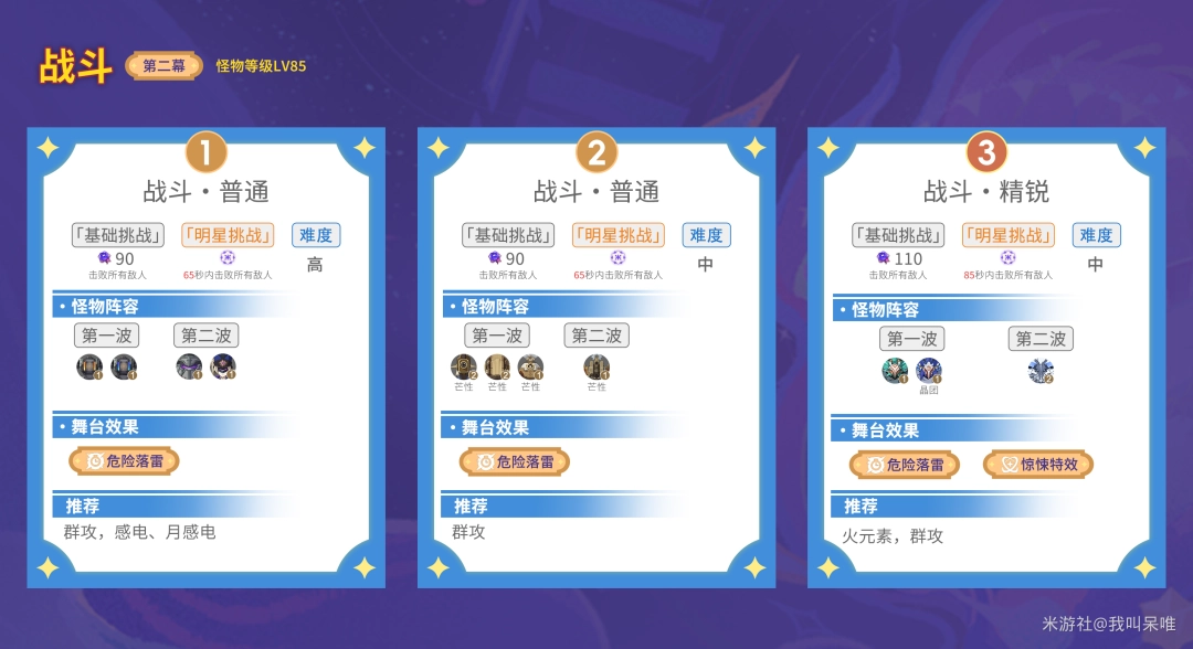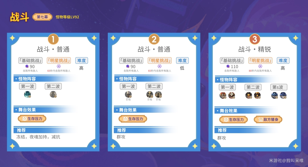 本关最好携带对单对群同时输出优秀的角色,第1波用AOE迅速收掉玄文兽(风C会比较吃力),第2波推荐携带夜魂加持角色或减抗角色应对,并不算简单的关卡。