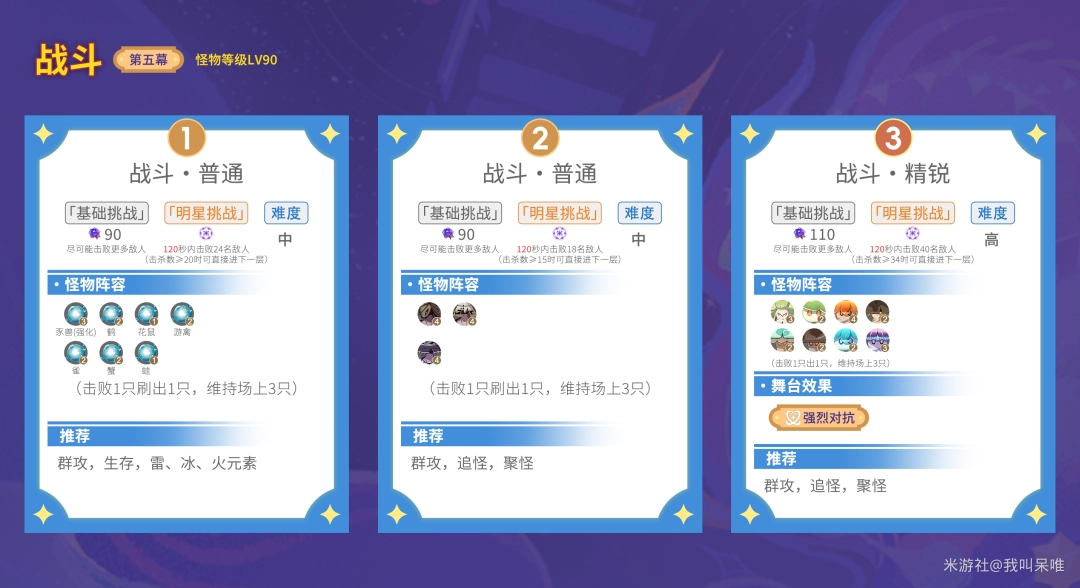 第5幕是怪物循环出现,要求我们达到一定的杀敌数量,输出要求明显有增加。低配建议不要死磕太难的关卡,配合BUFF选择合适的关卡即可。