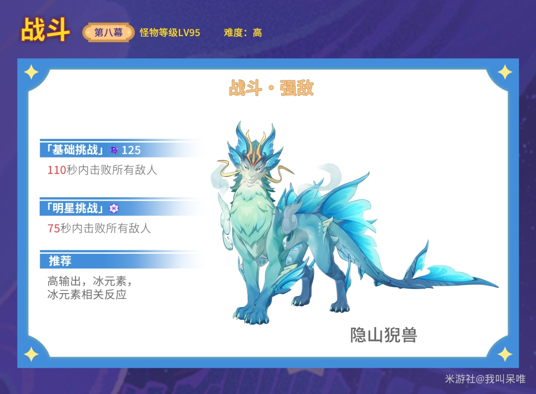 首先,隐山猊兽具有70%高额水抗、风抗,最好不要用水、风元素主C攻克。