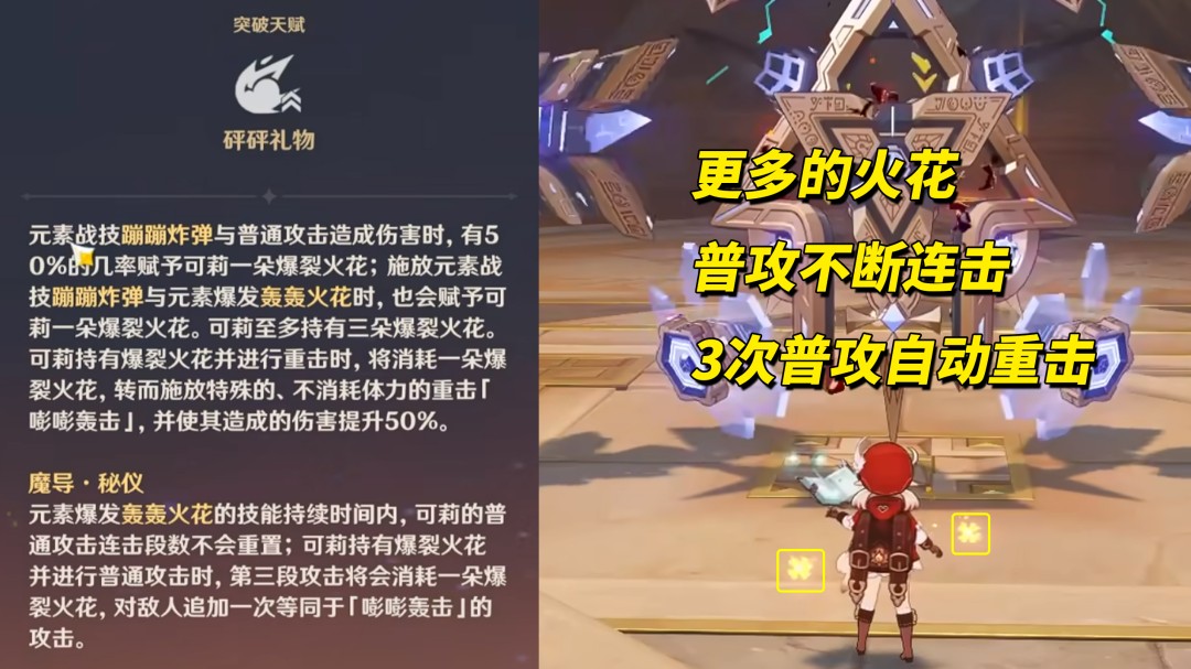新增“施放战技、爆发分别获得1朵爆裂火花。可莉至多持有三朵爆裂火花。”每轮循环可多打2、3个无消耗的特殊重击。
