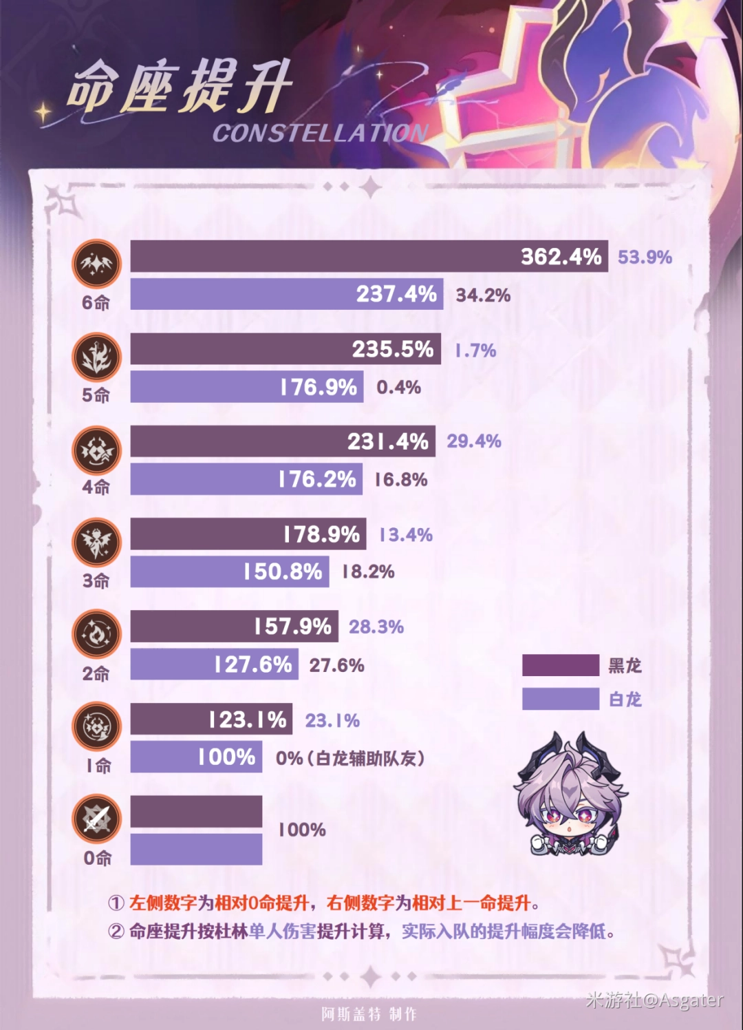 ② 重点是优化1命的层数效果,通过降低消耗层数的概率,变相地增加了覆盖的攻击次数——平均来看,白龙由覆盖20次攻击升至28次左右、黑龙由覆盖10次攻击升至14次左右。