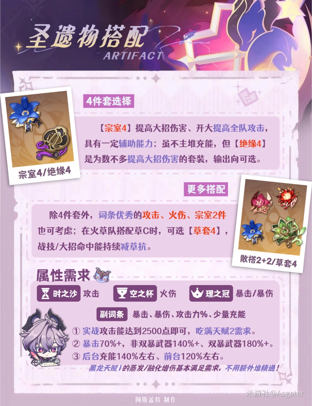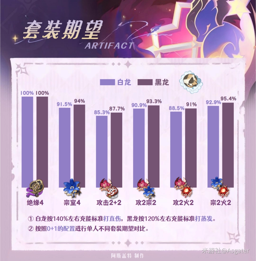 ① 当前提供大招加成的圣遗物并不多,使得即便是低充能【绝缘4】也能略胜一筹,适合想让杜林输出、已有队友装备【宗室4】的玩家。