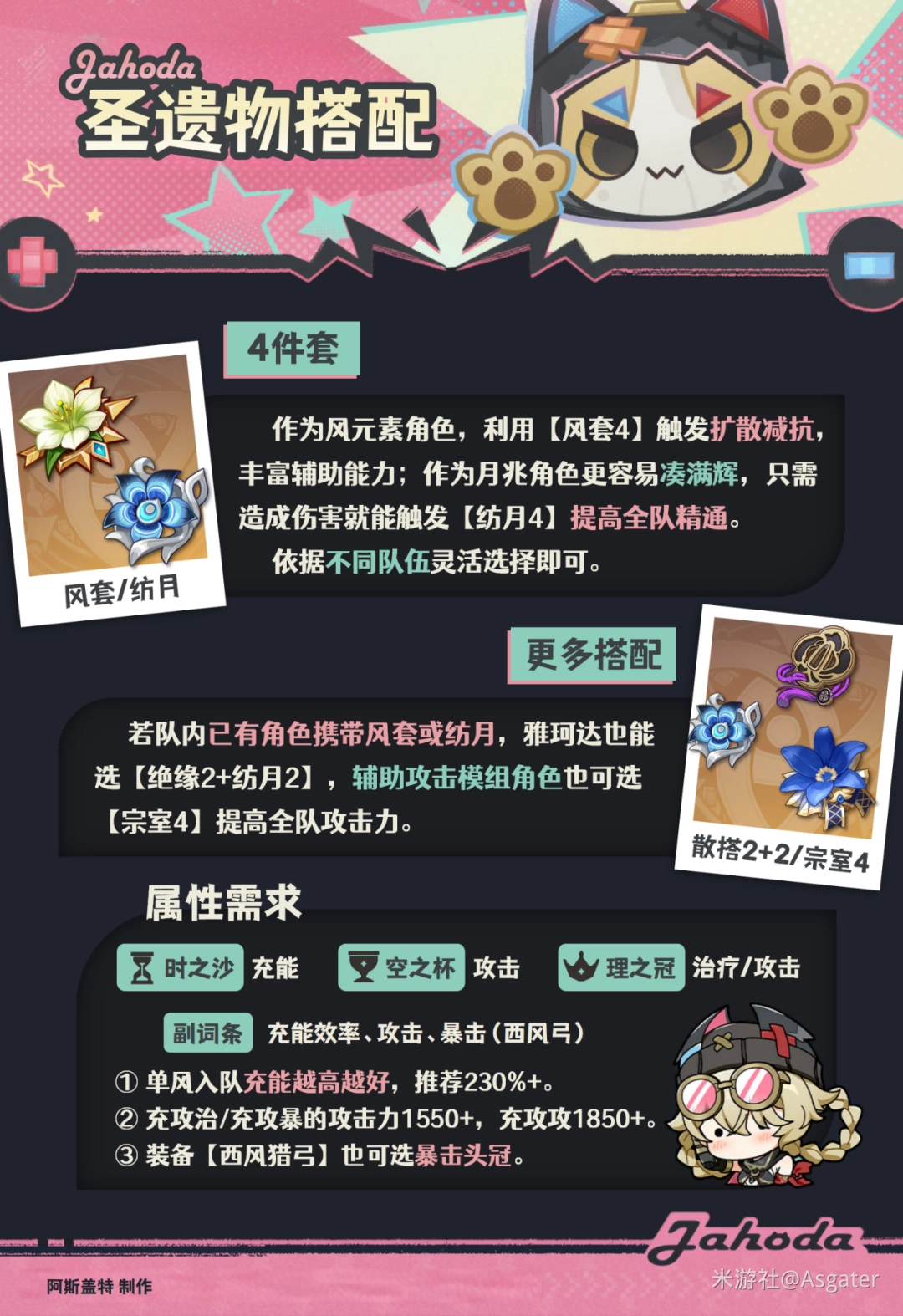 ⑤ 虽然雅珂达的治疗量与攻击力有关,但2件套并不需要专门考虑攻击2件、治疗2件,优先充能2件。