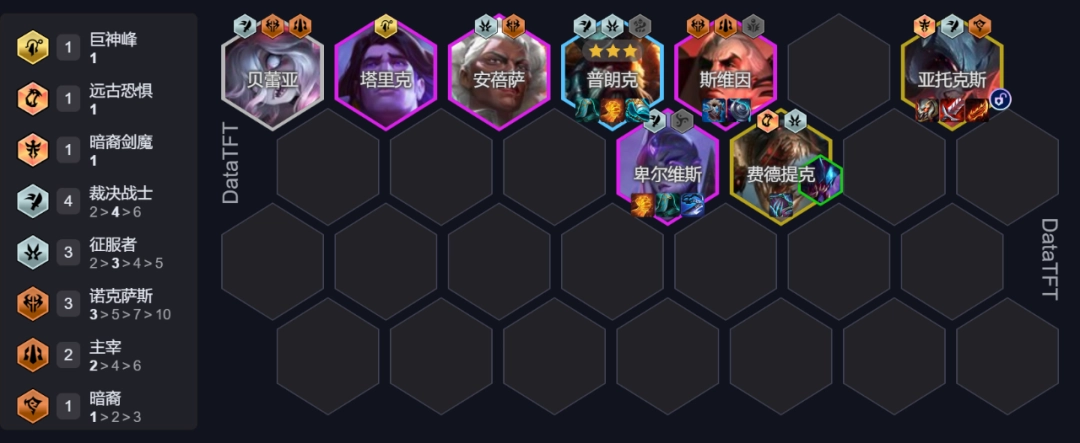 阵容简介:开局有正义或饮血剑去玩,因为需要4-2左右上8级开2裁决,给裁决单位带饮血、正义解锁剑魔。如果前期3比尔来的早,追三星船长当主C,来的晚剑魔、大卑、安蓓萨多C