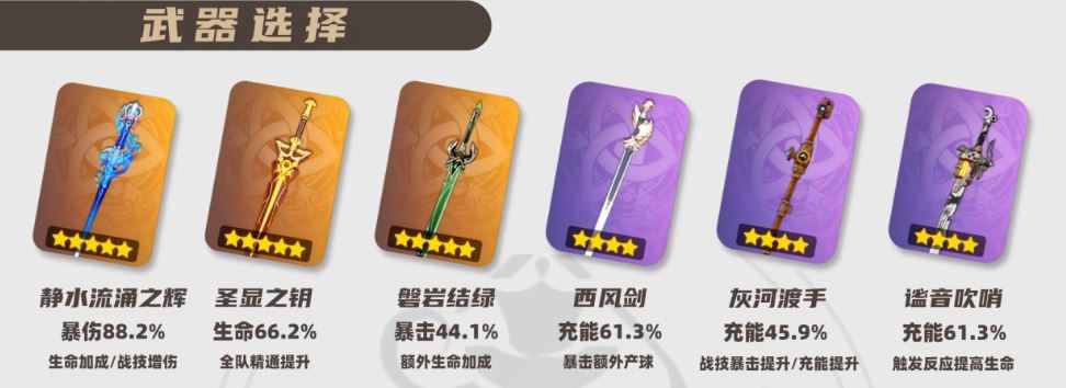 充能武器生命沙、非充武器充能沙;优选净水输出高、绿剑输出也不差,腐殖紧随其后选;没有这些选5星、裁叶/雾切/有乐/板砖择一;都没有就选择灰河渡手、西风剑。
