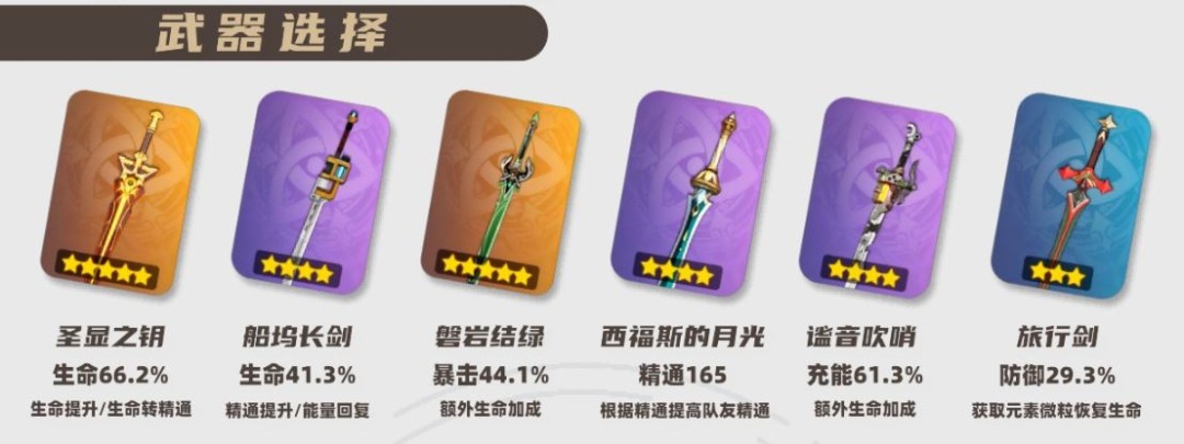 武器只推荐「圣显之钥」、「船坞长剑」,如有高精练磐岩结绿也可选择(仅精1推荐优先给其他单手剑输出角色),其他武器差别不大。