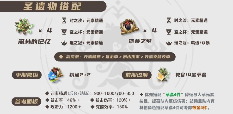 优先搭配“草套4件”降低敌人草元素抗性,提高队内草伤伤害;站场且队内有其他角色搭配草套4件可考虑饰金4件。