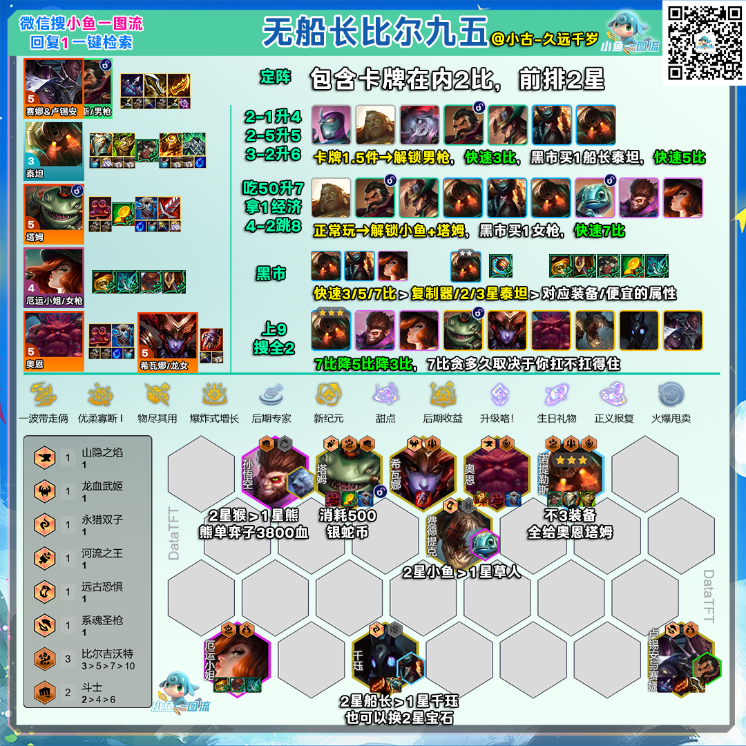 速3速5速7:卡牌带1.5件→解锁男枪快速3比,黑市买1张船长1张泰坦快速5比,7级上5个比→解锁小鱼+黑市买1张女枪快速7比(7比贪几轮取决于对局质量,扛不住就得开始降)