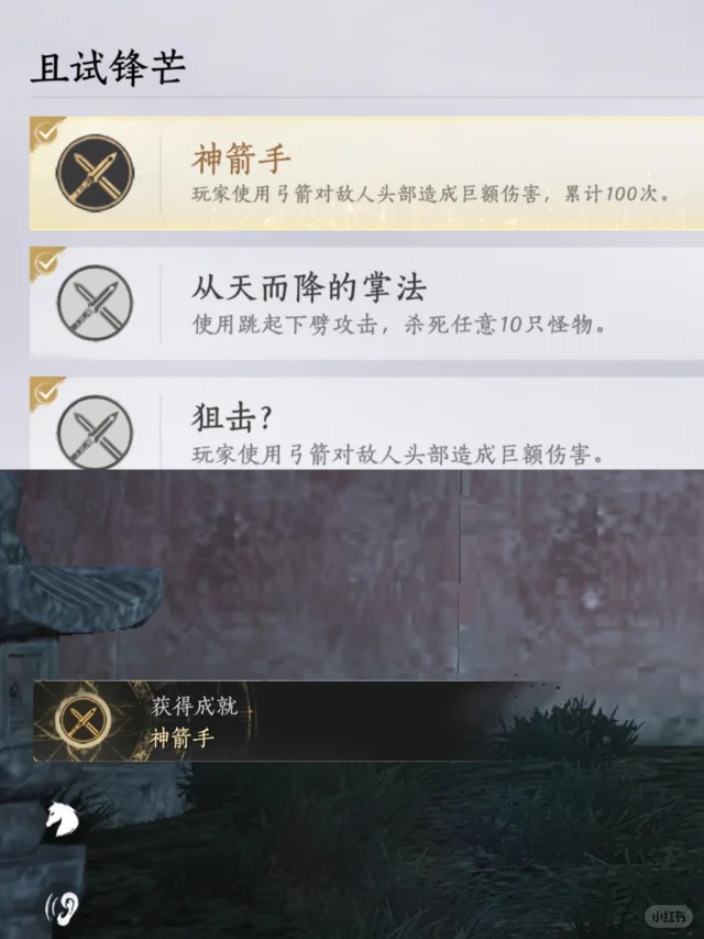 成就说明:玩家使用弓箭对敌人造成巨额伤害,累计100次