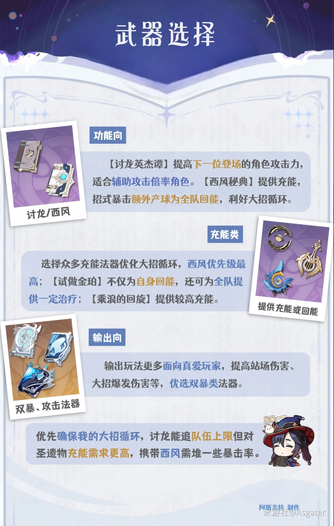 ①【逃龙英杰谭】用于辅助攻击倍率角色,但对圣遗物的充能需求较大(270%+甚至更高),通常双水后台时考虑。