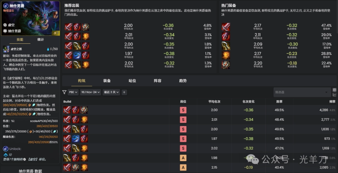 推荐饮血剑,斯特拉克的挑战护手,泰坦的坚决作为纳什男爵在云顶之弈中的最佳出装。这也是纳什男爵最热门的出装。
