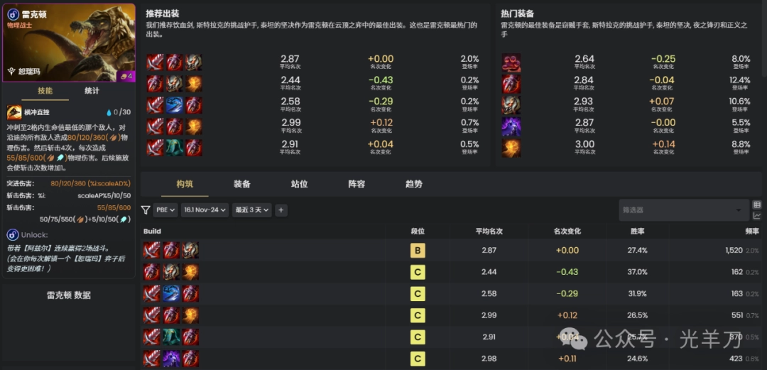 推荐饮血剑,斯特拉克的挑战护手,泰坦的坚决作为雷克顿在云顶之弈中的最佳出装。这也是雷克顿最热门的出装。
