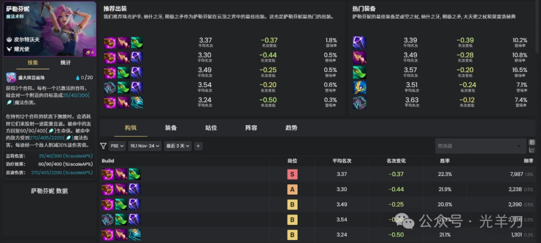 推荐珠光护手,纳什之牙,朔极之矛作为萨勒芬妮在云顶之弈中的最佳出装。这也是萨勒芬妮最热门的出装。