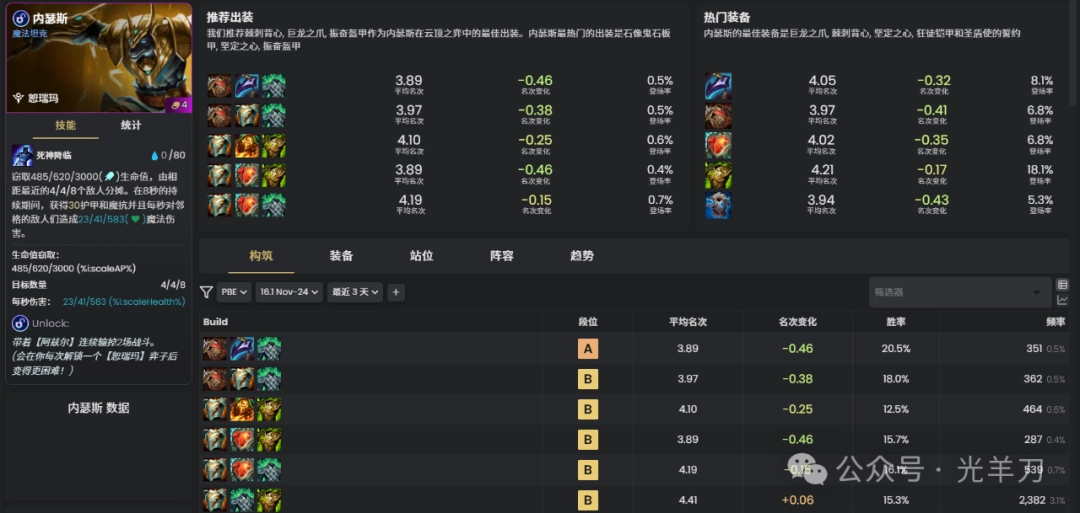 推荐荆棘背心,巨龙之爪,振奋盔甲作为内瑟斯在云顶之弈中的最佳出装。内瑟斯最热门的出装是石像鬼石板甲,坚定之心,振奋盔甲
