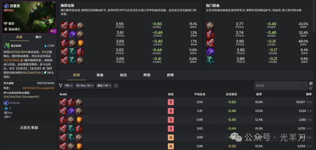 推荐饮血剑,斯特拉克的挑战护手,泰坦的坚决作为沃里克在云顶之弈中的最佳出装。这也是沃里克最热门的出装。